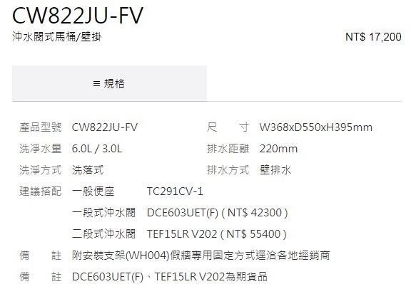 東陶TOTO - CW822JU-FV 壁排省水馬桶